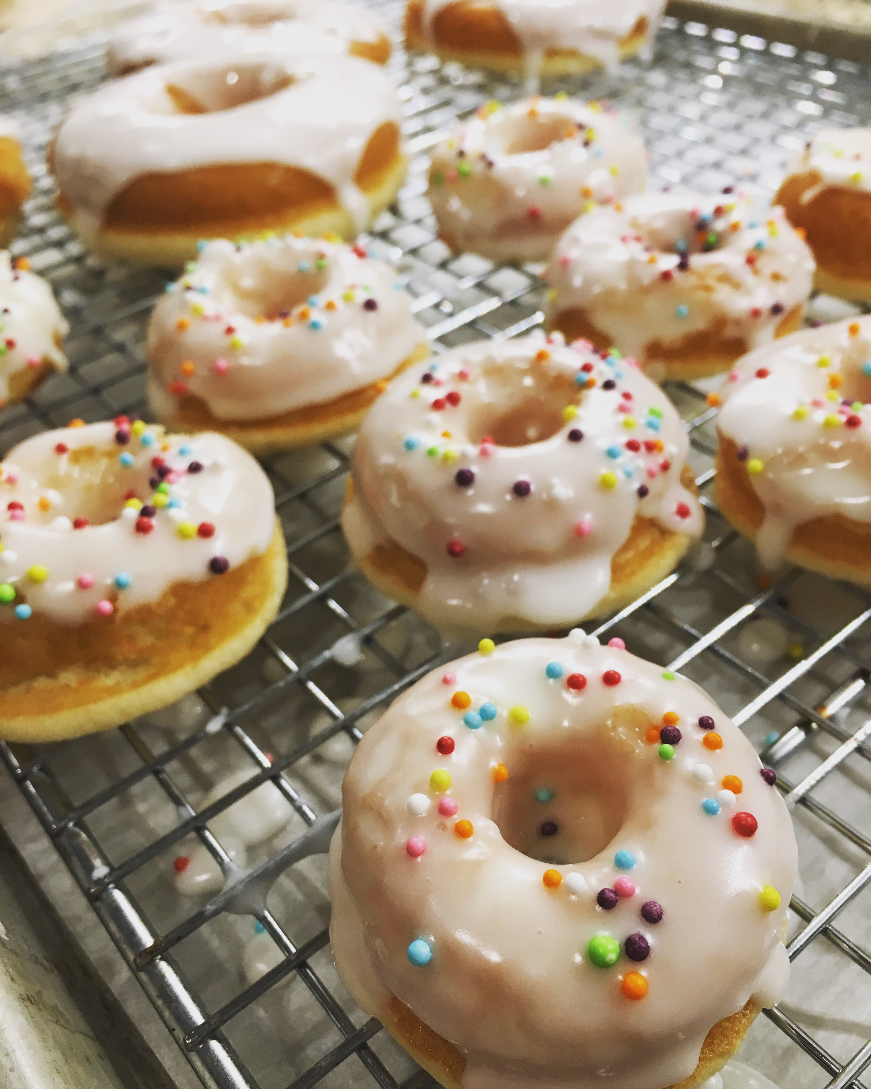 -Line a cookie sheet with parchment paper and rest a cooling rack on top. Pop your donuts out of your pan and onto the cooling rack to glaze.