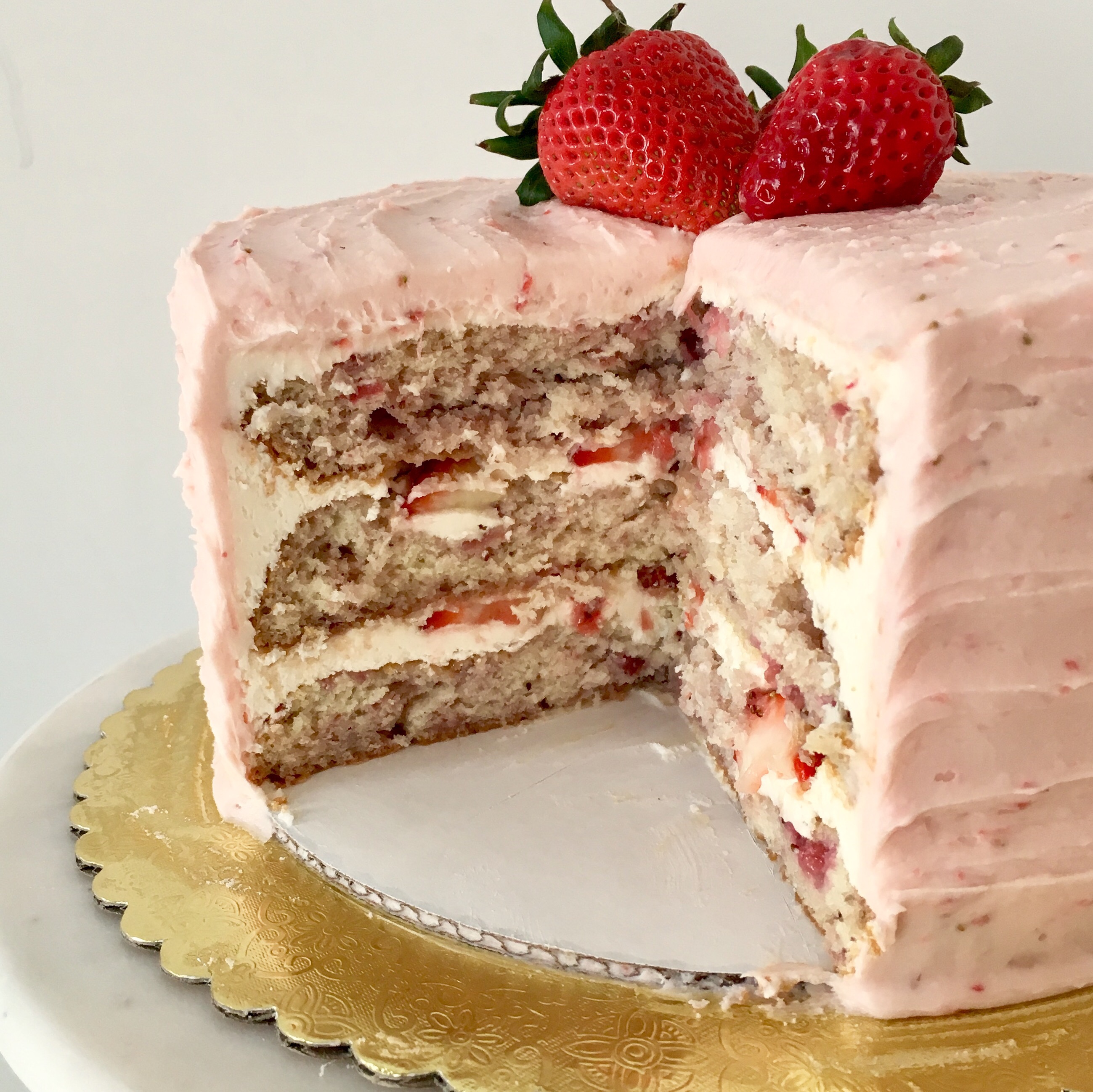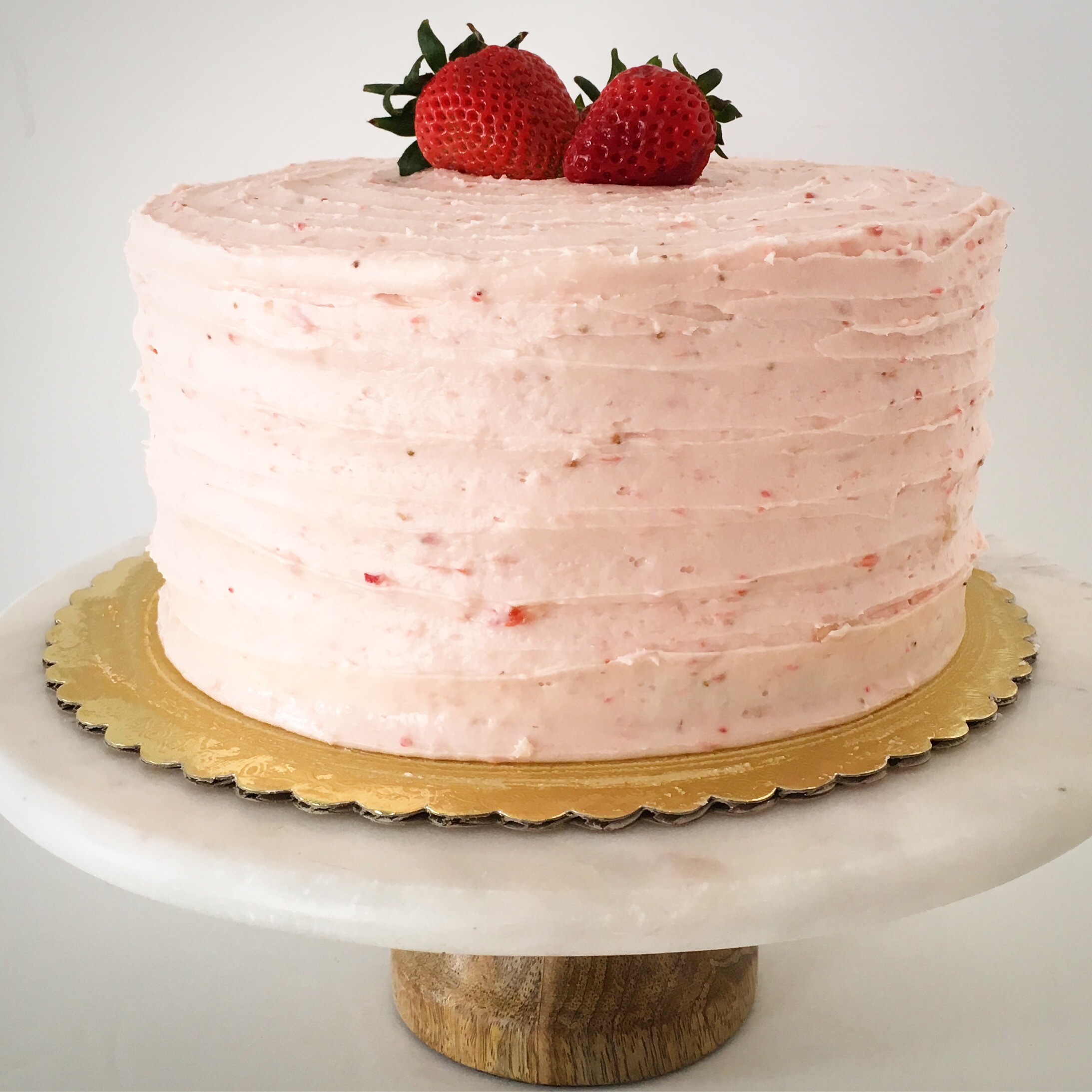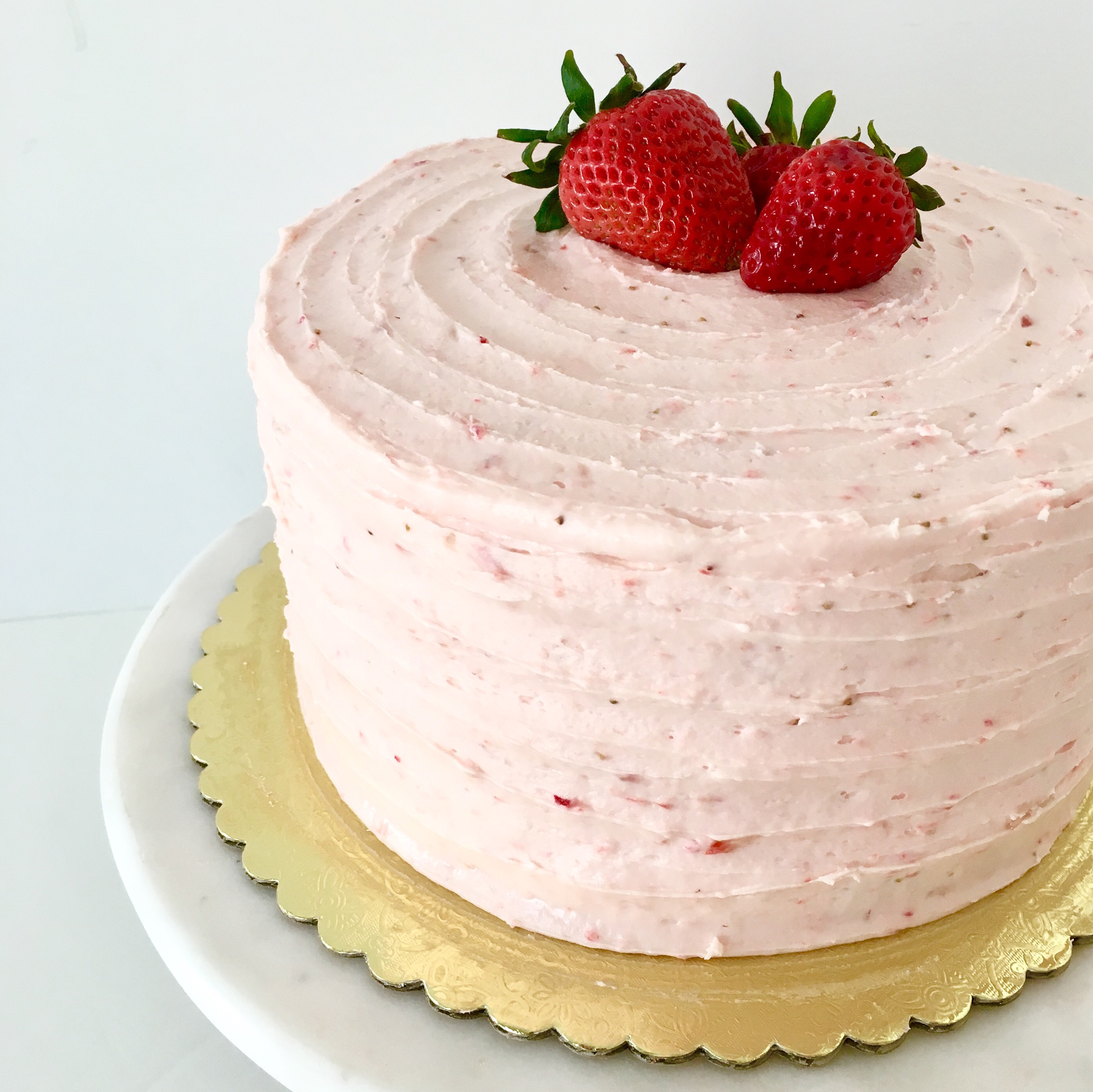I’m also including my recipe for fresh strawberry buttercream. I used a whipped vanilla buttercream and more sliced, fresh strawberries to fill the cake, but next time I’d probably just stick with the Strawberry Buttercream. Keep in mind that since you are using so many fresh berries, this cake needs to be refrigerated and will have a little shorter shelf life than usual. But that probably won’t be a problem. I really hope you love this recipe, its s new favorite in this house!
